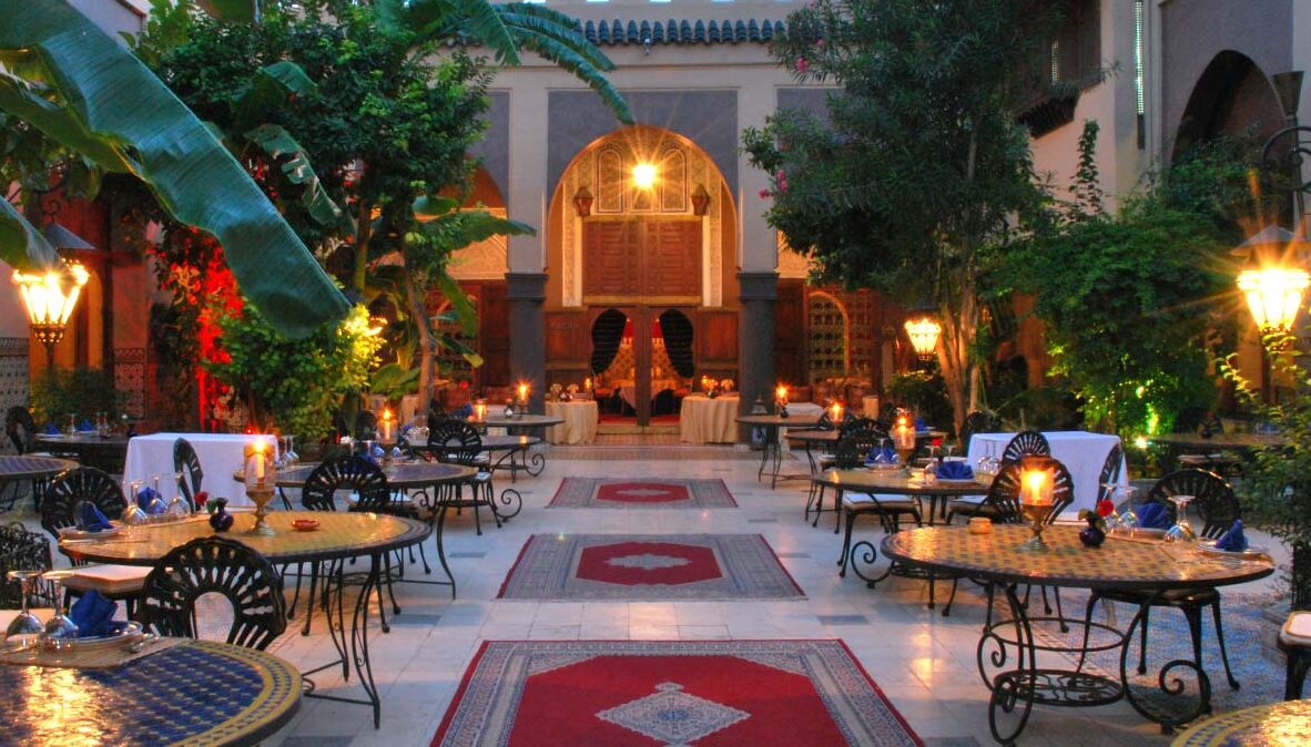 Installé dans un ancien palais au charme indéniable, ce restaurant emblématique de Marrakech séduit dès l’entrée par son patio fleuri, ses fontaines murmurantes et ses salons richement décorés de zelliges, stucs sculptés et boiseries traditionnelles.