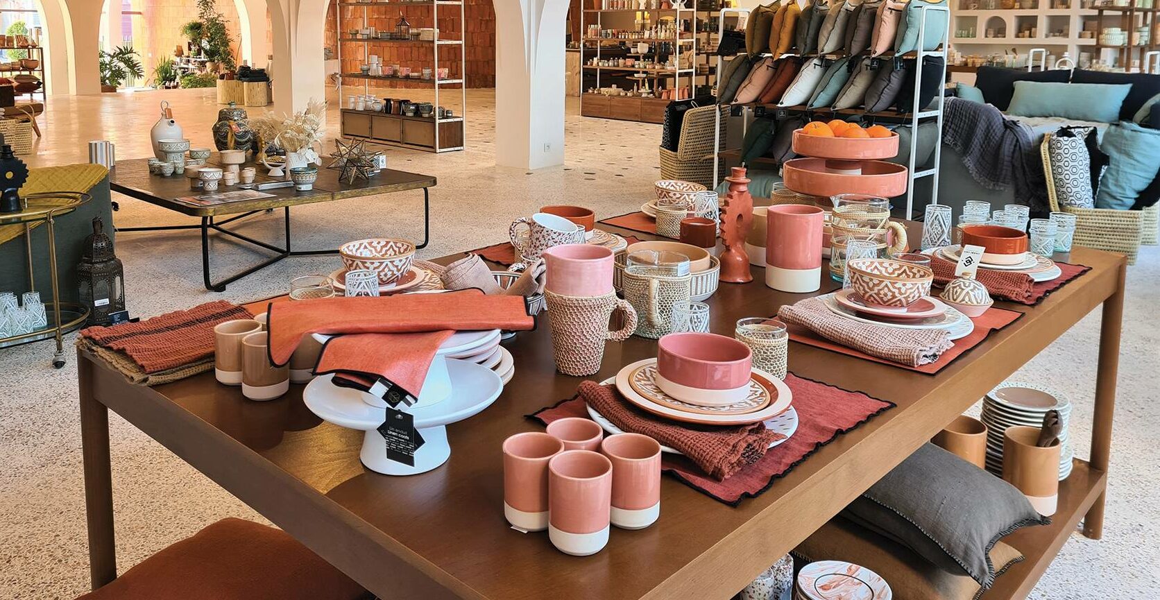 Dans ses rayons lumineux et soigneusement agencés, on découvre une large sélection d’objets du quotidien : vaisselle en céramique aux motifs délicats, verres soufflés à la bouche, plateaux en métal martelé, bougies parfumées, linge de maison aux textures naturelles, mais aussi une gamme de soins cosmétiques inspirés des rituels de beauté traditionnels marocains.