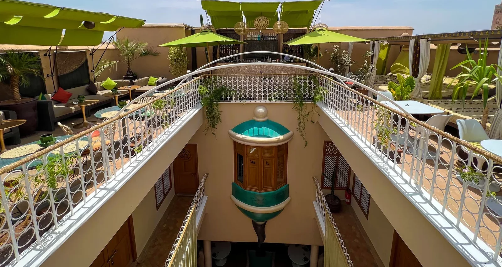 Avant le dîner, les hôtes sont invités à monter sur le rooftop panoramique pour savourer un cocktail maison face aux toits dorés de la médina.