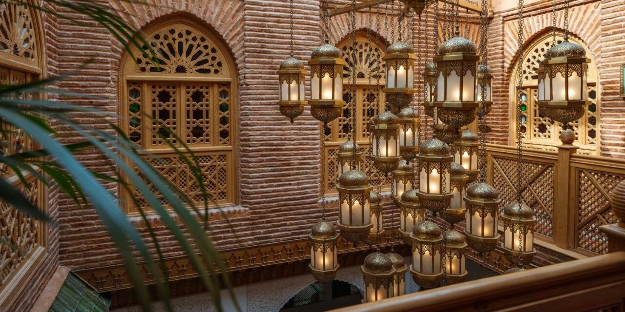 Derrière sa porte discrète, le riad dévoile un somptueux patio central orné de zelliges, stucs ciselés, boiseries anciennes et fontaines murmurantes.