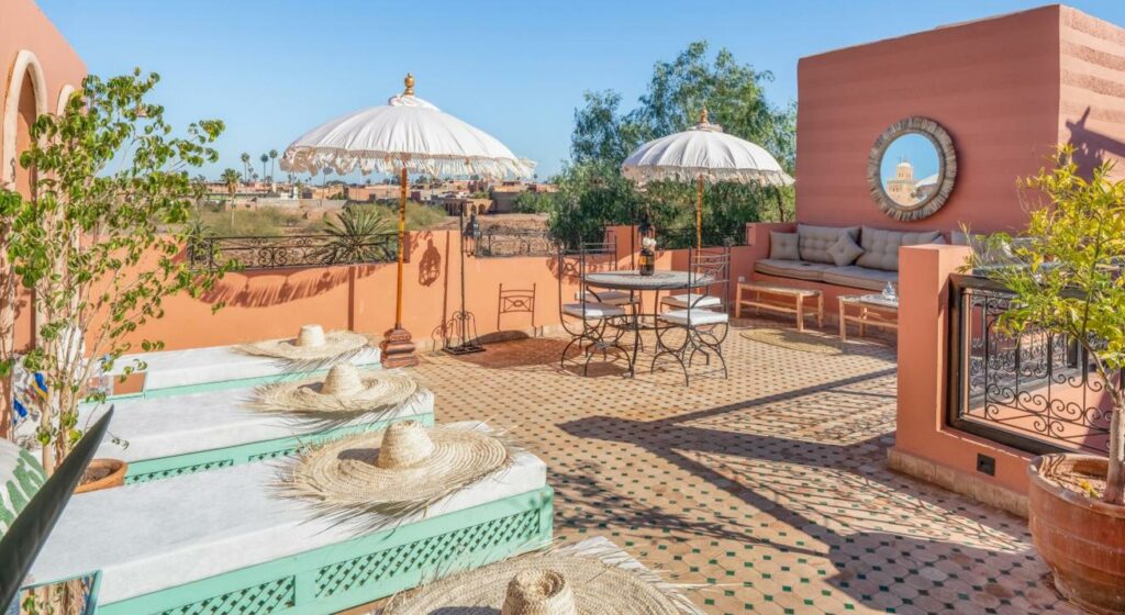 Sa terrasse panoramique offre un cadre privilégié pour contempler le coucher du soleil sur les toits de Marrakech et les montagnes de l’Atlas, tandis que le patio et les espaces de détente invitent à la relaxation.