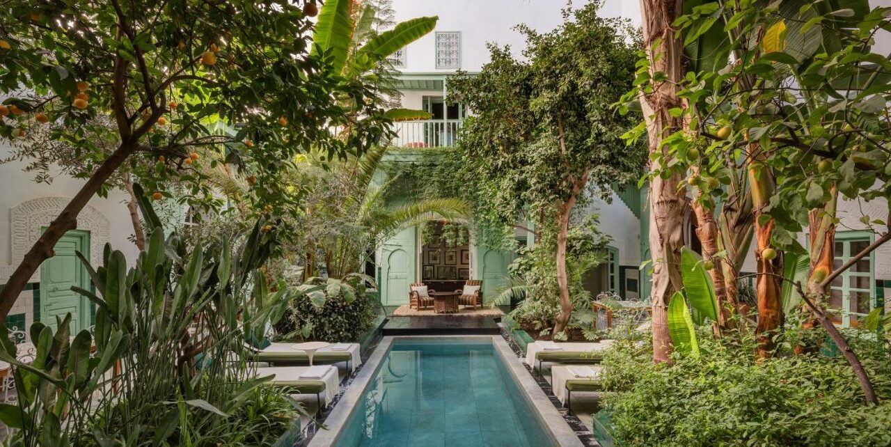 La terrasse panoramique invite à admirer le coucher du soleil sur les toits de Marrakech et les montagnes de l’Atlas, tandis que le patio et la piscine offrent des espaces de détente paisibles et apaisants.